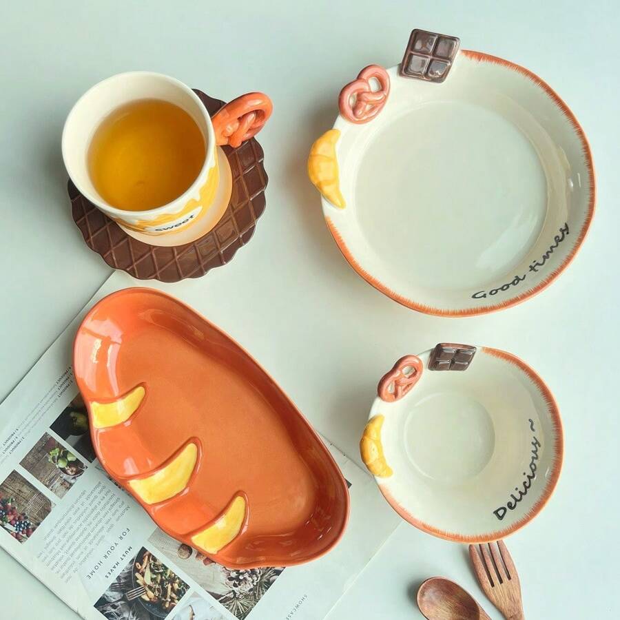 1pc Ins Cute Embossed Dessert Ceramic Dinnerware Set, Includes 350ml/11.84oz Mug, 8 Inch Breakfast Plate, 5 Inch Salad Bowl, High-Quality Home Use