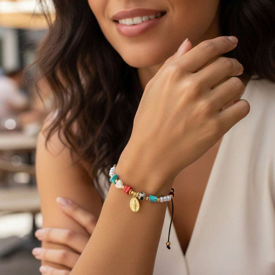 1pc Women's Bracelet With Faux Pearl, Colorful Beads, And Virgin Mary Pendant, Minimalist Luxurious Design