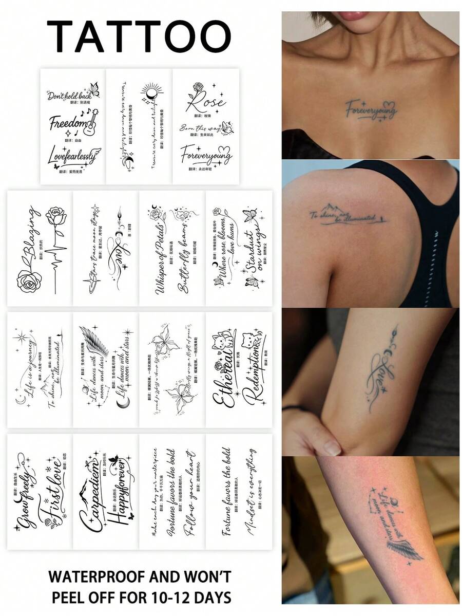 5Pcs Fake Tattoo Temporary Tattoos Semi Permanent Tattoo Floral Letter English Y2K Waterproof Sweatproof Last For 1-2 Weeks Realistic Herbal Juice Anti-Friction Non-Reflective Black For Woman And Men Tattoo Stickers For Arm, Chest, Leg, Abdomen, Waist, Finger, Neck, Spine, Modernist Body Art