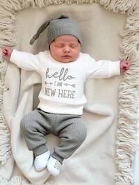 SHEIN Newborn HELLO Letter Embroidered Outfit Set, Infant Tops, Bottoms, Hat, Baby Photography Clothes For 1 Month To 100 Days Old, Unisex Fall Winter