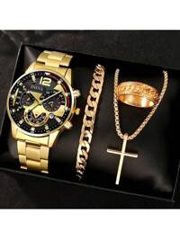 4pcs/Set Elegant Men's Fashion Business Date Quartz Watch & Pendant Necklace, Ring, And Bracelet - Jewelry Set - Perfect Gift For Valentine's, Easter, Halloween, Birthdays, Christmas,Ideal Gift For Him,Mom,Mother,Mother's Day,Gift 4pcs 18K Gold Plated Stainless Steel Men's Fashion Jewelry Set, Waterproof & Fade-Resistant, 3D Five-Leaf Flower Bracelet, Four-Leaf Flower Zirconia Stud Bracelet, Four-Leaf Clover Stud Bracelet, Suitable For Daily Wear, Parties, Gifts For Family, Friends, Valentine's Day, Christmas #3 Bestseller