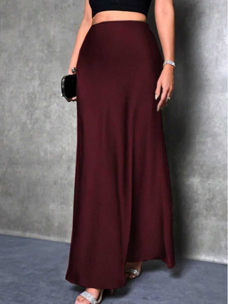 Solid Color High Waist Elegant Charmeuse Satin Skirt, Women Plus Size Midi Skirt, Suitable For Spring, Summer, Autumn