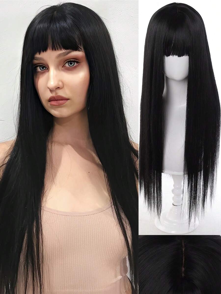 Straight Cosplay Wig With Bangs Black Long Anime Cosplay Synthetic Hair Suitable For Women's Daily Wear And Party , Made With Heat-Resistant Synthetic Fibers.