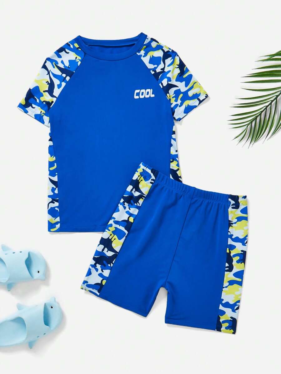 SHEIN Tween Boys' Tight-Fitting Leisure Camouflage Round Neck T-Shirt, Shorts, And Swimwear 3pcs/Set