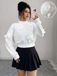 Elenzga Women's Summer Outing, Dating, New Year, Valentine's Day, Easter, Mother's Day, Music Festival, Middle Eastern, Wedding, Elegant, Vintage, Casual, Commute, Romantic, Vacation, Round Neck, Ruffle Trim, Faux Crystal Embellished, 3D Floral, Regular Fit, Waist Cinched, Long Sleeve Sweatshirt, White
