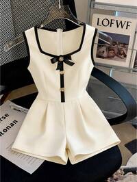 SoleiaSoleia Women's Leisure Vacation V-Neck Halter Bowknot Front Hollow Black And White Contrast Trim Bodycon Ribbed Jumpsuit, Versatile For Party, Date, Afternoon Tea, Seaside Beach, Inner Or Outerwear,, Boho Vacation, Graduation, Church, Beach, Music Festival White Playsuit #6 Bestseller
