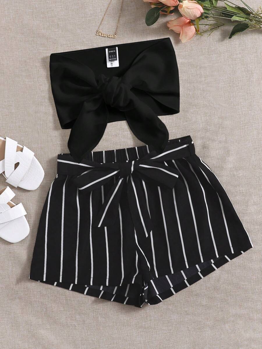 Soleia Women's Front Tie Strapless Top And Striped Woven Shorts Set
