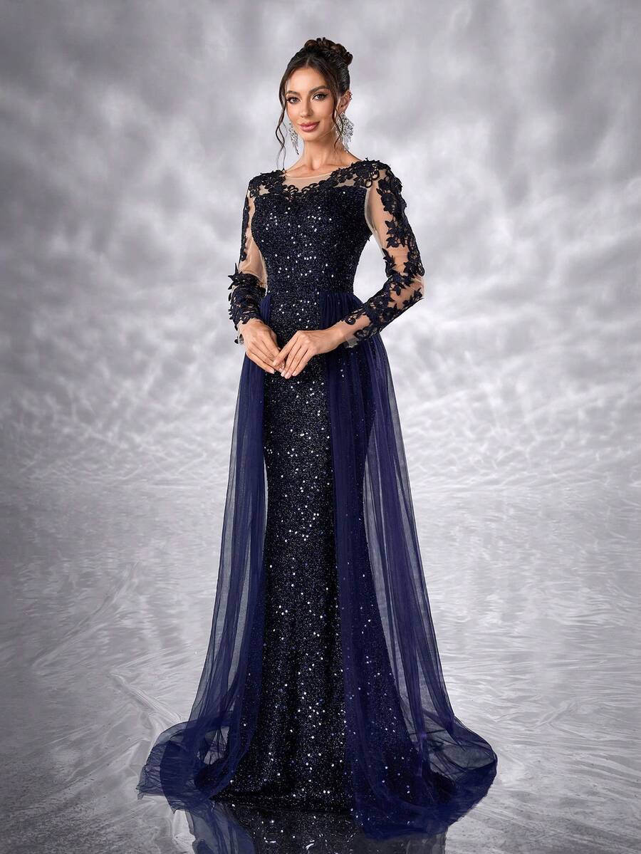 YISIKADO Women Sequin Glitter Evening Dress Floral Appliques Mesh Long Sleeve Round Neck Formal Prom Party Dress Ball Gown Wedding Guest Dress, For Graduation, Banquet Dinner Ceremony Celebration Ceremonial Dress