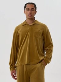 Musero Oversized Long Sleeve Velour Button Up Polo Style Collared Pocket Patch Detail Drop Shoulder Top Tracksuit Co Ord Shirt Only Satin Detailing Winter
