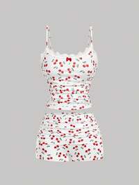 SHEIN MOD White Polyester Fabric Two-Piece Set, Red Cherry Print, Strapless Ruched Bustier Top, Sweetheart Neckline, Red Lace Trim, Small Bow Detail, High-Waisted Tiered Mini Skirt, Ruffle Layers, Red Piping Edges, Lightweight Material, Smooth Texture, Breathable Fabric, Playful Design, Feminine Silhouette, Fitted Top, Flared Skirt, Vibrant Color Contrast, Comfortable Wear, Youthful Style, Casual Look, Delicate Stitching, Eye-Catching Pattern.