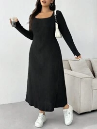 SHEIN EZwear Plus Size Black Turtleneck Long Casual Dress, Versatile For Dates, Outings And Commuting,Fall /Autumn/Winter,Christmas,New Year,Thanksgiving,Party,Wedding,Beach,Graduati,Chic,Elegant,Casual,Going Out,Date,Appointment,Commute,Back-To-School,Graduation,Formal,Sexy