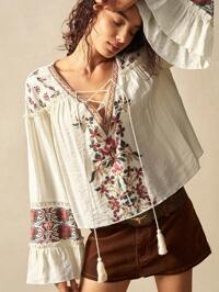 Soleia Women's Retro Newspaper Print V-Neck Front Tie Bow Flare Sleeve Asymmetric Ruffle Hem A-Line Top, Suitable For Vacation, Early Autumn, Party, Date, Afternoon Tea, Layering,Graphic Tops,Night Out Going Out Tops,Back To School,Homecoming Vintage Blouse Shabby Chic Top Feminine Top Rose Print Blouse #7 Bestseller
